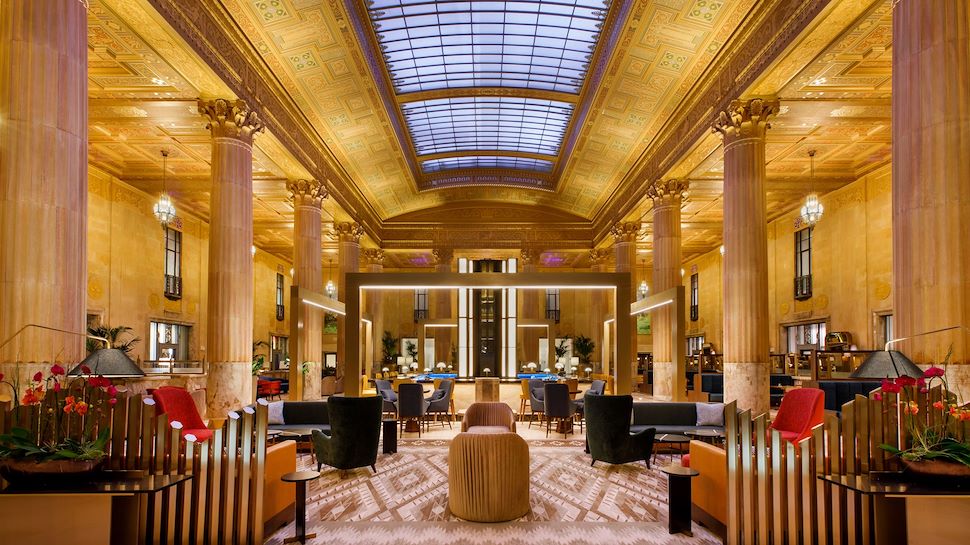 The National, Autograph Collection transforms approximately 190,000 square feet of the 1931 First National Bank office tower into an inspired hotel with 146 guest rooms. The restoration is part of the First National Center project and includes the preservation of murals, decorative painted ceilings, stone columns, cast stone, metal finishes, vault doors, and safes.